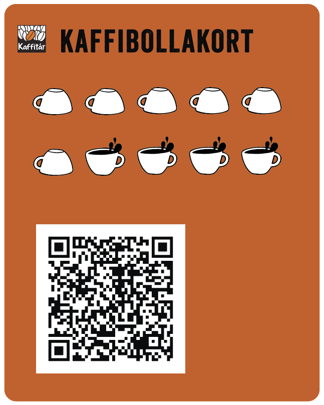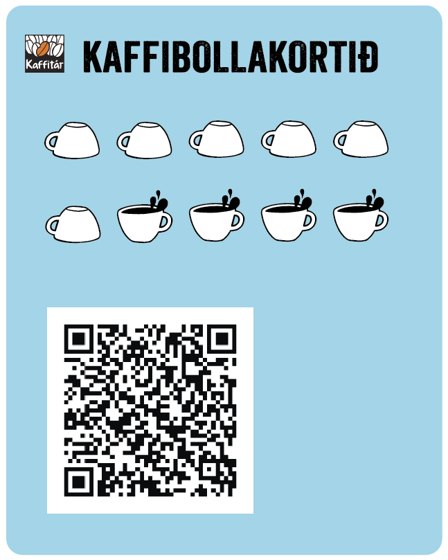 Kaffibollakort. Fyrir hvern keyptan kaffidrykk færð þú tóman bolla á kortið. 10 tómir bollar eru jafnvirði kaffidrykkjar að eigin vali. Sækja (ertu í síma? Afritaðu hlekkinn og opnaðu í vafra) |