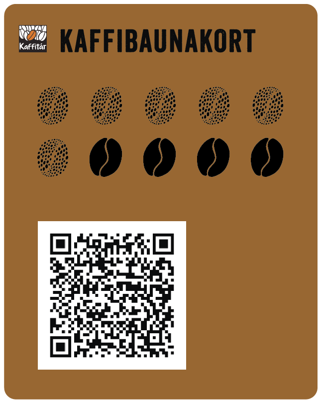 Kaffibaunakort. Fyrir hvern keyptan Kaffipakka færð þú malaða kaffibaun á kortið. 10 malaðar kaffibaunir eru jafnvirði 250g kaffipakka að eigin vali. Sækja