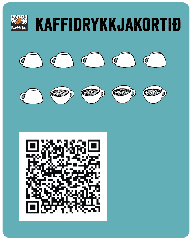 Kaffidrykkjakortið: 10 kaffidrykkir; Latte, Svalur Latte, Cappuccino, Flat White, Cortado, Macchiato, Davinci, Svalur Davinci, Chai. Verð 6.100 kr. Kaupa (ertu í síma? Afritaðu hlekkinn og opnaðu í vafra) |