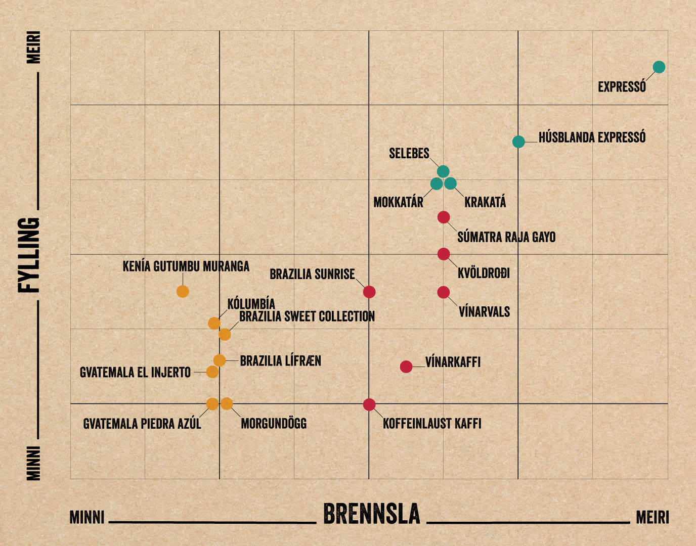 Hver kaffitegund er flokkuð eftir fyllingu, brennslu og bragðtónum sem mun auðvelda kaffiunnendum að velja kaffi við sitt hæfi.
